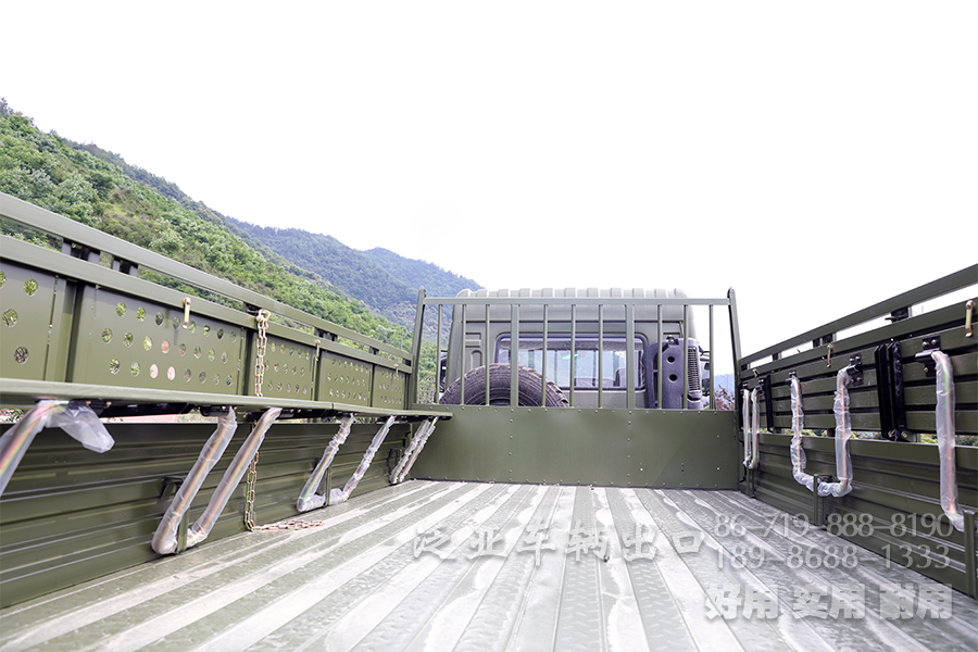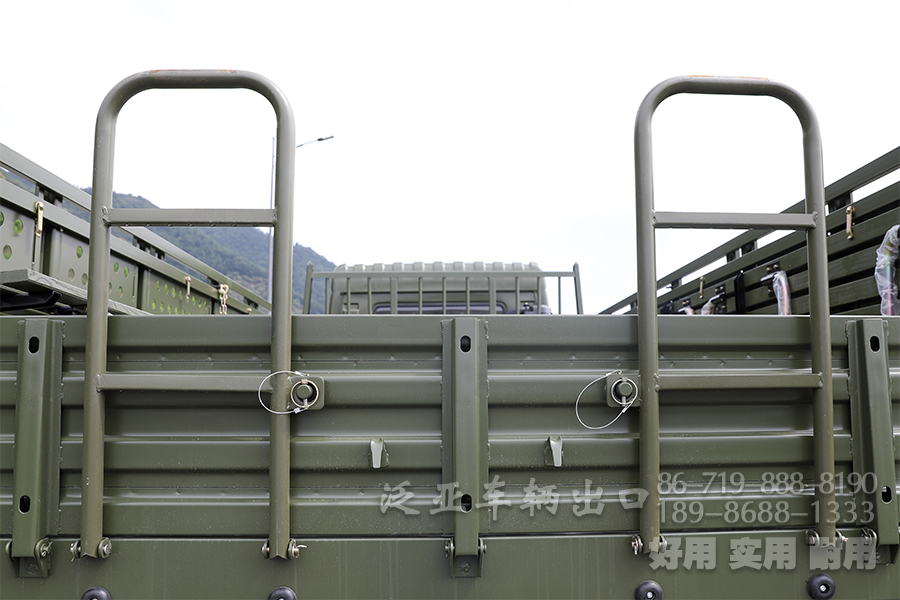 两侧可以安插棚布和棚杆,在下雨的时候就可以避免货箱内的人或者货物遭到雨水的浸湿。货箱的尾侧我们安装了两个爬梯,爬梯到时候需要就是为了方便上下。这里是两个防撞减震块,货箱的两侧,安装有可折叠的翻转座椅。