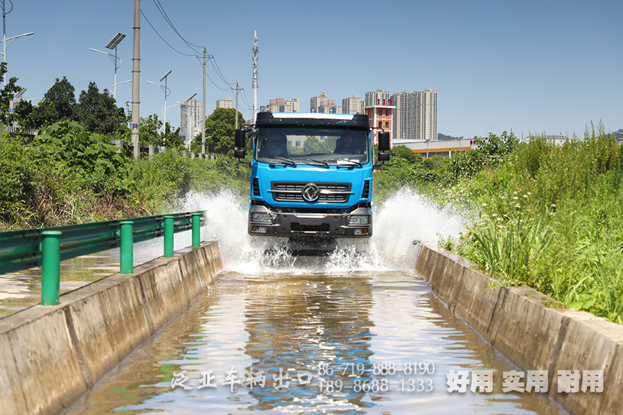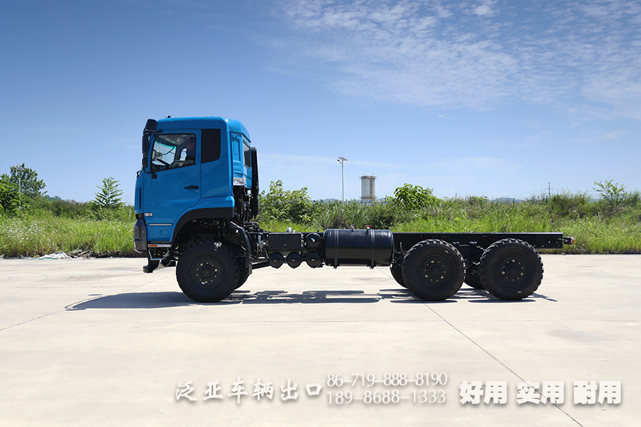 6x6东风重型专用车底盘,总质量可达25吨,六轮驱动使得它可以在山路、森林等地区行驶,适合改装成载货卡车、自卸汽车、混凝土搅拌车等专用重型车。