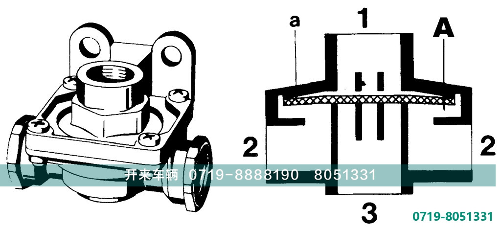 制动时,压缩空气从1口进入,将阀片a紧压在排气口上,气流经A腔从2口进入制动气室。